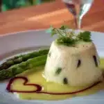 Un plat réconfortant de blanc manger onctueux accompagné d’un cœur coulant délicat sur une crème d’asperges.