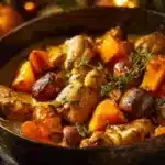 Un plat réconfortant et savoureux qui marie la dinde, le potiron, et les marrons pour capturer l’essence des saveurs d’automne.