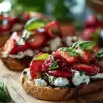 Un plat festif et plein de fraîcheur qui associe ricotta crémeuse et fraises juteuses sur du pain grillé. Parfait pour les apéritifs d’été.