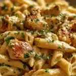 Un plat réconfortant de pâtes au poulet avec une sauce crémeuse et du parmesan, parfait pour rassembler la famille autour de la table.
